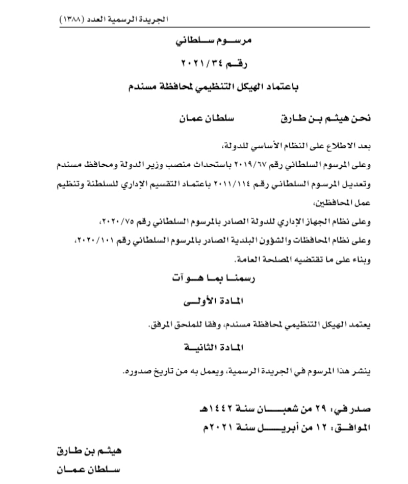 صدر المرسوم السلطاني رقم (٣٤ / ٢٠٢١) باعتماد الهيكل التنظيمي لمحافظة مسندم وفقًا للملحق المرفق بالمرسوم، وذلك في الثاني عشر من أبريل 2021م.