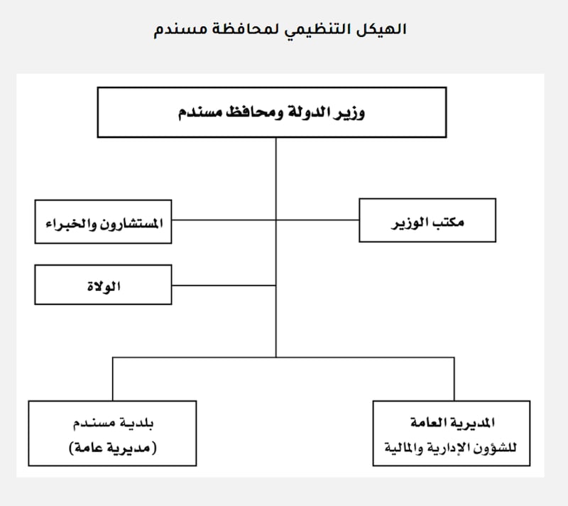ويأتي على رأس الهيكل وزير الدولة ومحافظ مسندم وتتبعه عدة جهات مثل مكتب الوزير، والمستشارون والخبراء، والولاة، والمديرية العامة للشؤون الإدارية والمالية، وبلدية مسندم.