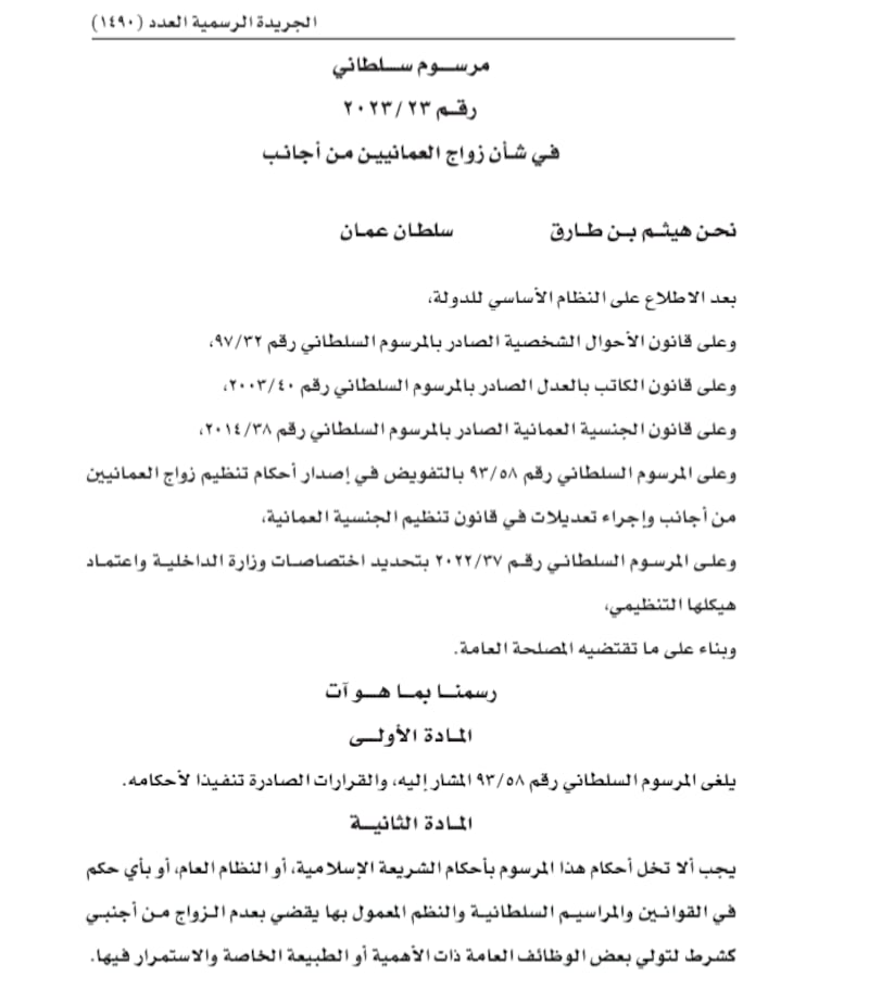 في السادس عشر من أبريل 2023م صدر المرسوم السلطاني رقم ٢٣ / ٢٠٢٣ في شأن زواج العمانيين من أجانب، وتكون من سبع مواد بعد إلغاء المرسوم السلطاني رقم (58/93).