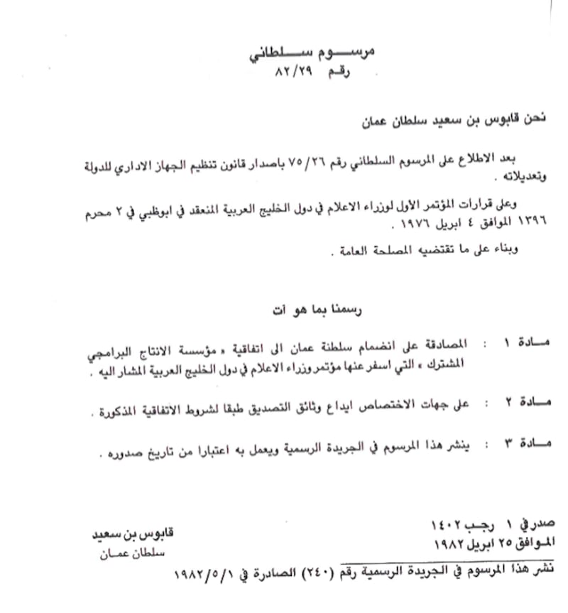 في هذا اليوم صدر المرسوم السلطاني رقم ٢٩ / ٨٢ بالمصادقة على انضمام سلطنة عمان إلى اتفاقية مؤسسة الإنتاج البرامجي المشترك.