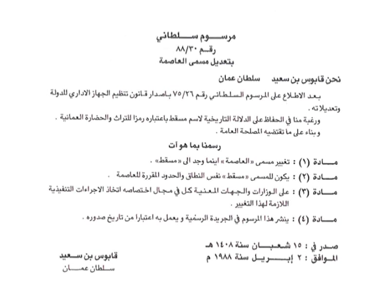 في الثاني من أبريل 1988م صدر المرسوم السلطاني رقم ٣٠ / ٨٨ بتعديل مسمى العاصمة، حيث نصّ المرسوم على تغيير مسمى (العاصمة) أينما وجد إلى (مسقط)، وأن يكون للمسمى الجديد نفس النطاق والحدود المقررة للعاصمة.