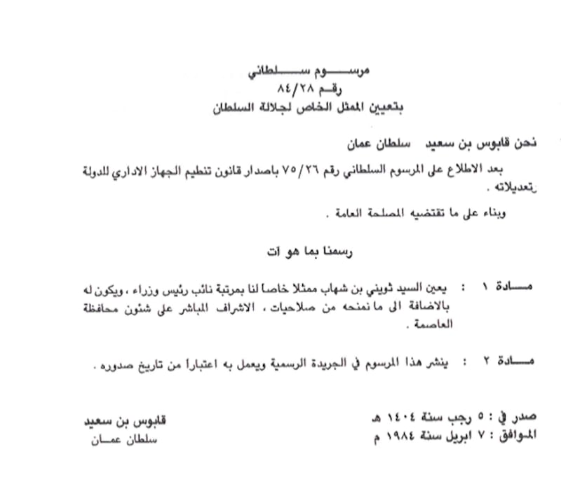 في السابع من أبريل عام 1984م صدر المرسوم السلطاني رقم ٢٨ / ٨٤ القاضي بتعيين الممثل الخاص لجلالة السلطان، حيث تم تعيين السيد ثويني بن شهاب آل سعيد ممثلًا خاصًا بمرتبة نائب رئيس وزراء، مع إشرافه المباشر على شؤون محافظة العاصمة.