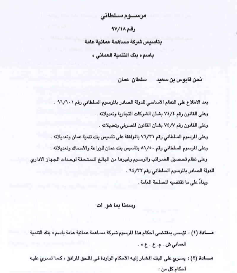 في هذا اليوم صدر المرسوم السلطاني رقم ١٨ / ٩٧ بتأسيس شركة مساهمة عمانية عامة باسم “بنك التنمية العماني”.