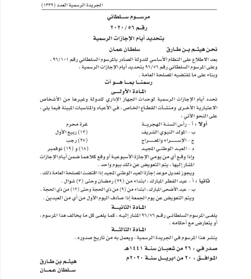 في العشرين من أبريل 2020 أصدر حضرة صاحب الجلالة السلطان هيثم بن طارق المعظم حفظه الله ورعاه المرسوم السلطاني رقم (٥٦ / ٢٠٢٠) بتحديد أيام الإجازات الرسمية.