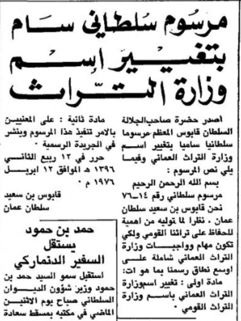 في الثاني عشر من أبريل عام 1976م صدر المرسوم السلطاني رقم ١٤ / ٧٦ القاضي بتغيير اسم “وزارة التراث العماني” إلى اسم “وزارة التراث القومي”.