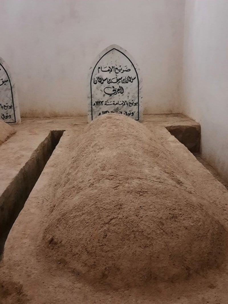 ويوجد في البرج الغربي ضريح الإمام سلطان بن سيف الثاني باني هذا الحصن.