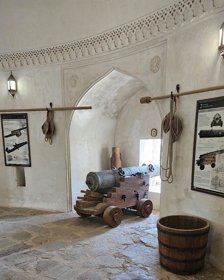 ويضم الحصن خمسة مدافع برتغالية وإسبانية الصنع جلبت من مسقط والتي حصل عليها العمانيون في معاركهم الحربية البحرية. كما يحتوي على عدد من الغرف تم استخدامها لأغراض مختلفة للإدارة والسكن والتدريس وحفظ المؤن والذخائر، إضافة إلى الممرات السرية وقنوات المياه.