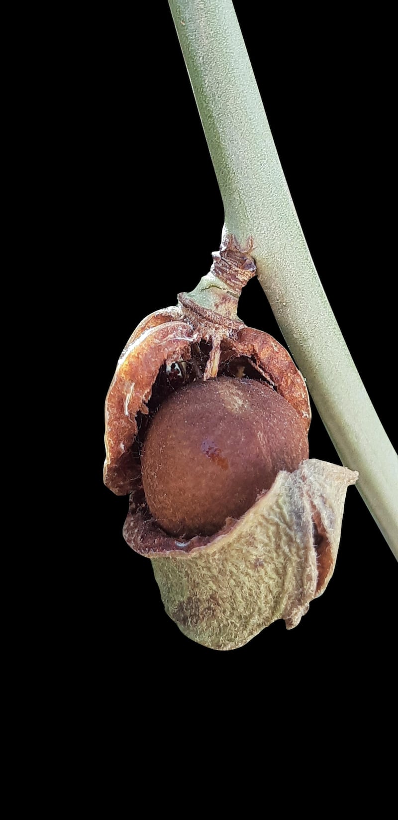 وأضاف أن ثمار الشجرة، وهي نووية الشكل، تبدأ بلون رمادي مخضر وتتحول إلى بني مخضر عند النضج، بينما تنتج فروعها صمغًا طبيعيًا بلون العسل، كان يُجمع قديمًا للاستهلاك ويُعتقد أن له فوائد صحية خصوصا للمعدة.