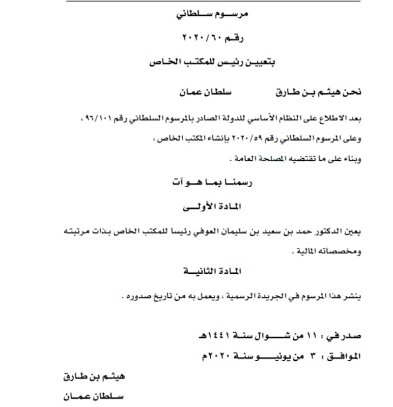 في الثالث من يونيو سنة 2020م صدر المرسوم السلطاني رقم (60/2020) القاضي بتعيين الدكتور حمد بن سعيد العوفي رئيسًا للمكتب الخاص بذات مرتبته ومخصصاته المالية.
