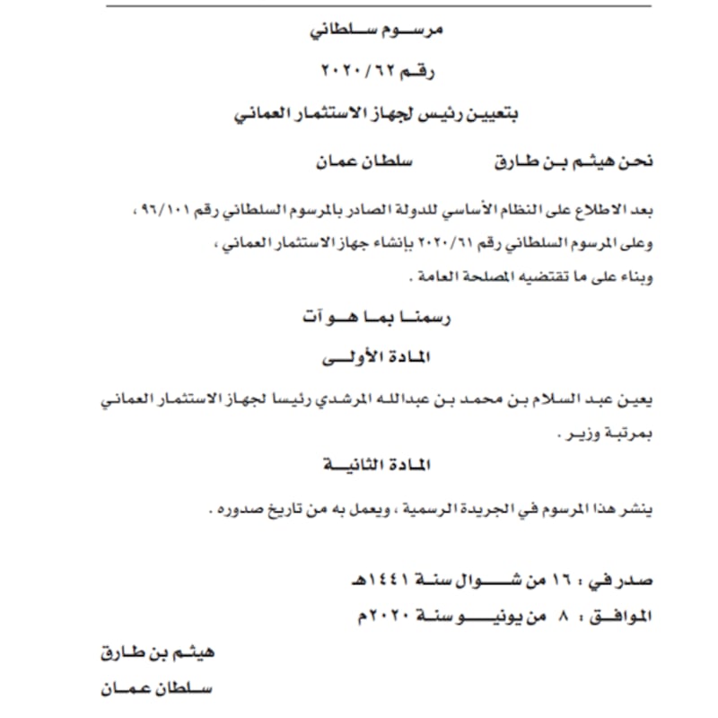 وكان السلطان هيثم بن طارق حفظه الله قد أصدر المرسوم السلطاني رقم ٦١ / ٢٠٢٠ بإنشاء جهاز الاستثمار العماني، تكون له الشخصية الاعتبارية، ويتمتع بالاستقلال المالي والإداري، ويتبع مجلس الوزراء، وذلك في الرابع من يونيو سنة 2020م.