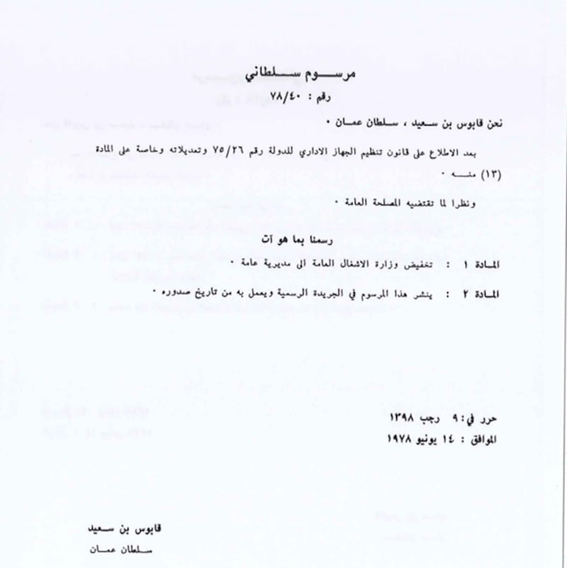في الرابع عشر من يونيو عام 1978م صدر المرسوم السلطاني رقم (40/78) والذي قضى بتخفيض وزارة الأشغال العامة إلى مديرية عامة.