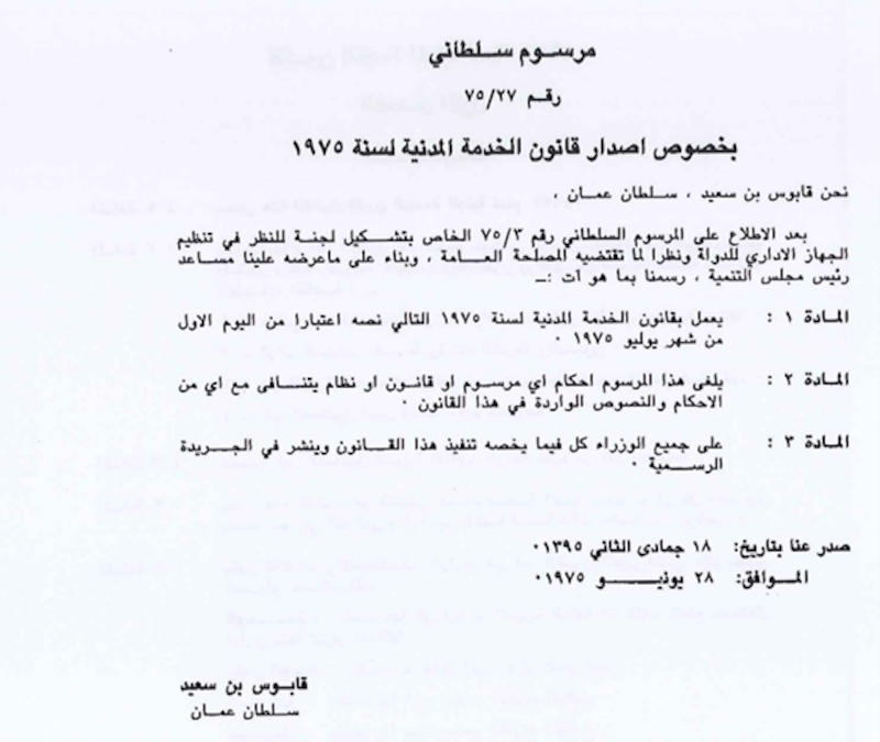في الثامن والعشرين من يونيو عام 1975م صدر المرسوم السلطاني رقم (27/75) بخصوص إصدار قانون الخدمة المدنية لسنة 1975، حيث نص على أن يعمل بقانون الخدمة المدنية لسنة 1975 اعتبارًا من اليوم الأول من شهر يوليو 1975م، ويلغي هذا المرسوم أحكام أي مرسوم أو قانون أو نظام يتنافى مع أي من الأحكام والنصوص الواردة في القانون.