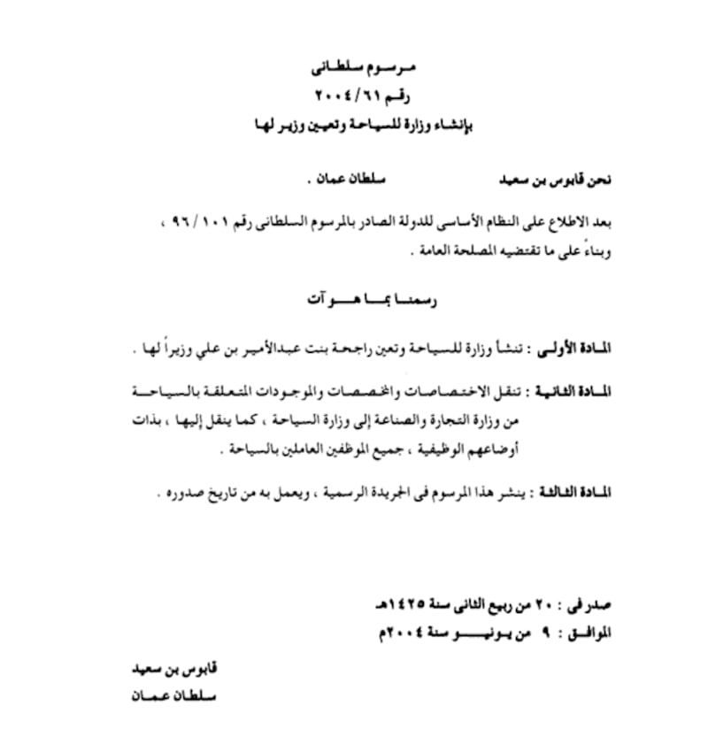 في التاسع من يونيو سنة 2004م صدر المرسوم السلطاني رقم (61/2004) القاضي بإنشاء وزارة للسياحة وتعيين راجحة بنت عبد الأمير بن علي وزيرًا لها، على أن تنقل الاختصاصات