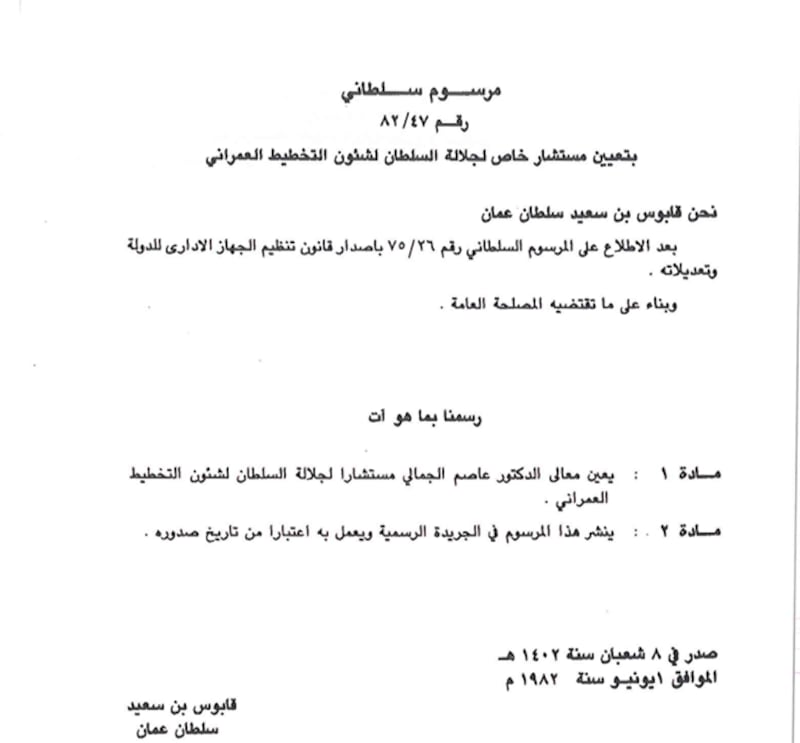 في الأول من يونيو عام 1982م صدر المرسوم السلطاني رقم (47/82) والذي قضى بتعيين معالي الدكتور عاصم بن علي الجمالي مستشارًا لجلالة السلطان لشؤون التخطيط العمراني.