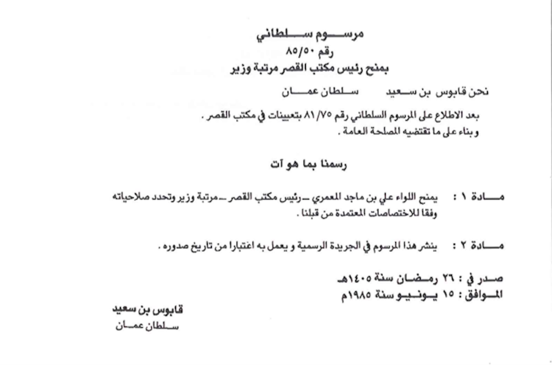 في الخامس عشر من يونيو من عام 1985م صدر المرسوم السلطاني رقم (50/85) الذي قضى بمنح اللواء علي بن ماجد المعمري، رئيس مكتب القصر، مرتبة وزير، وتحدد صلاحياته وفق الاختصاصات المعتمدة من قبل المقام السامي.