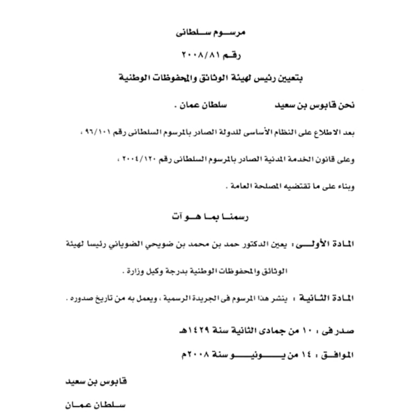في الرابع عشر من يونيو سنة 2008م صدر المرسوم السلطاني رقم (81/2008) القاضي بتعيين الدكتور حمد بن محمد الضوياني رئيسًا لهيئة الوثائق والمحفوظات الوطنية بدرجة وكيل وزارة.