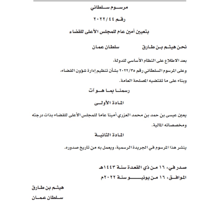 في السادس عشر من يونيو سنة 2022م صدر المرسوم السلطاني رقم (44/2022) القاضي بتعيين عيسى بن حمد بن محمد العزري أمينًا عامًا للمجلس الأعلى للقضاء بذات درجته ومخصصاته المالية.