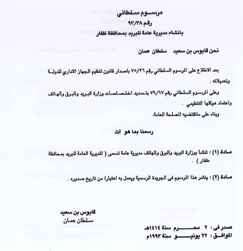 في الثاني والعشرين من يونيو عام 1993م صدر المرسوم السلطاني رقم (38/93) التي قضى بإنشاء مديرية عامة تسمى ( المديرية العامة للبريد بمحافظة ظفار) تتبع وزارة البريد والبرق والهاتف.