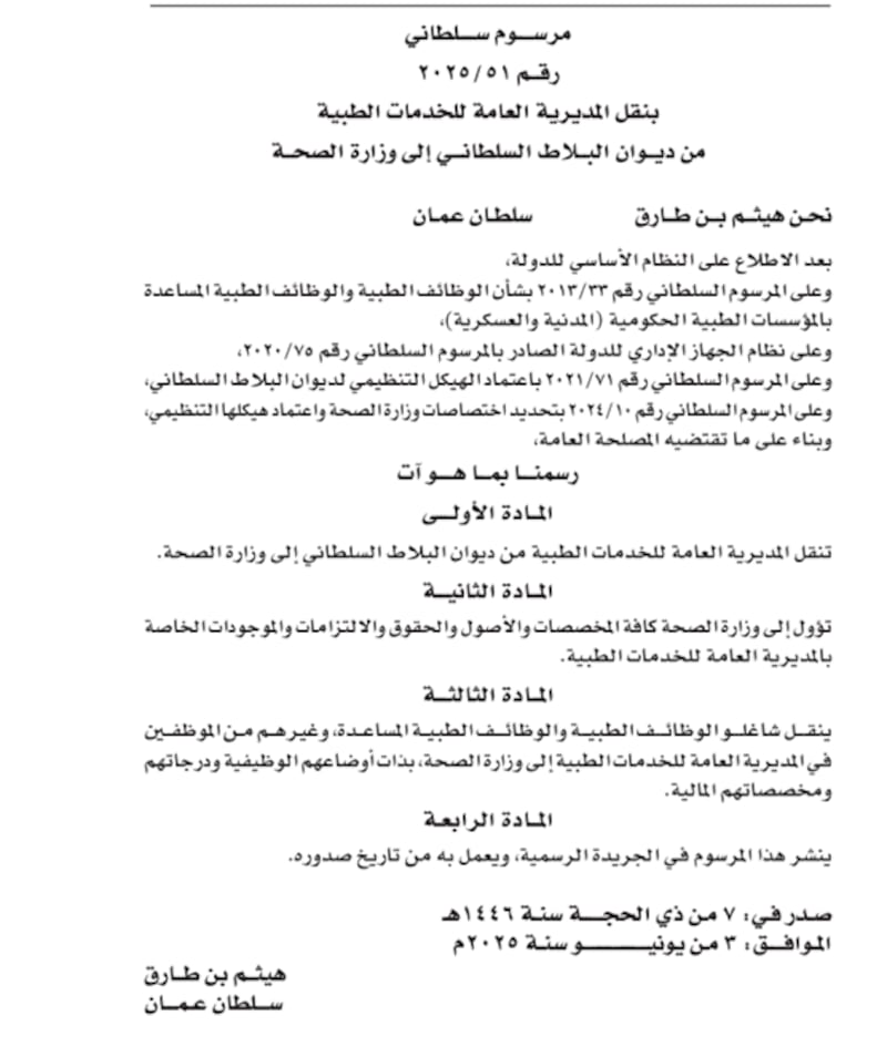 صدر في الثالث من يونيو سنة 2025م المرسوم السلطاني رقم (51/2925) القاضي بنقل المديرية العامة للخدمات الطبية من ديوان البلاط السلطاني إلى وزارة الصحة، على أن تؤول إلى وزارة الصحة كافة المخصصات والأصول والحقوق والالتزامات والموجودات الخاصة بالمديرية العامة للخدمات الطبية.