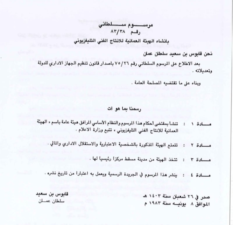 في الثالث من يونيو عام 1983م صدر المرسوم السلطاني رقم (38/83) الذي قضى بإنشاء هيئة عامة باسم (الهيئة العمانية للإنتاج الفني التلفزيوني) تتبع وزارة الإعلام، تتمتع بالشخصية الاعتبارية والاستقلال الإداري والمالي، وتتخذ من مدينة مسقط مركزًا رئيسيًا لها.