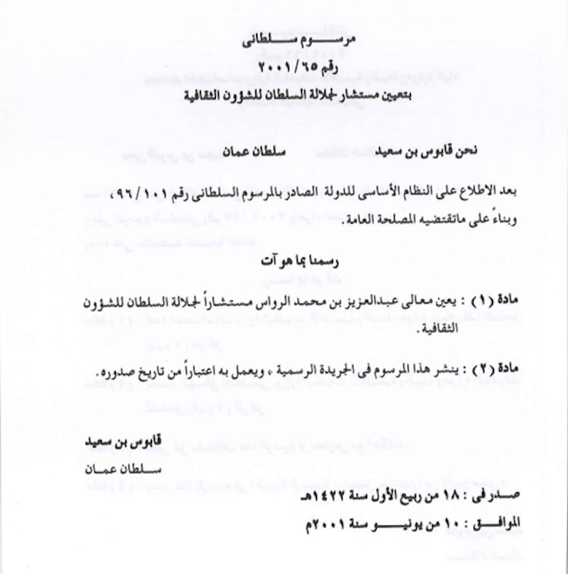 في العاشر من يونيو سنة 2001م صدر المرسوم السلطاني رقم (65/ 2001) الذي قضى بتعيين معالي عبد العزيز بن محمد الرواس مستشارًا لجلالة السلطان للشؤون الثقافية.