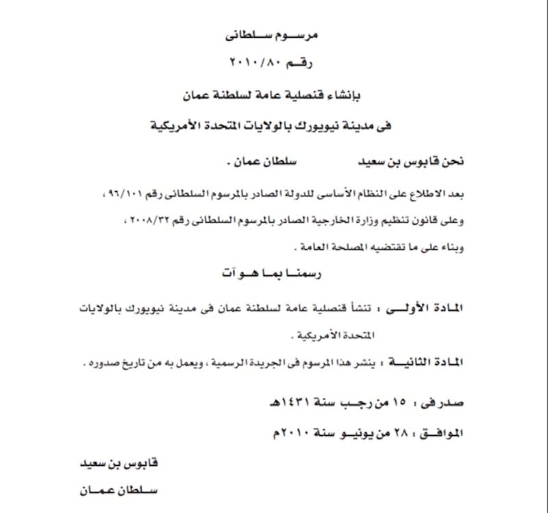 في 28 يونيو سنة 2010م صدر المرسوم السلطاني رقم (80/2010) الذي قضى بإنشاء قنصلية عامة لسلطنة عمان في مدينة نيويورك بالولايات المتحدة الأمريكية.