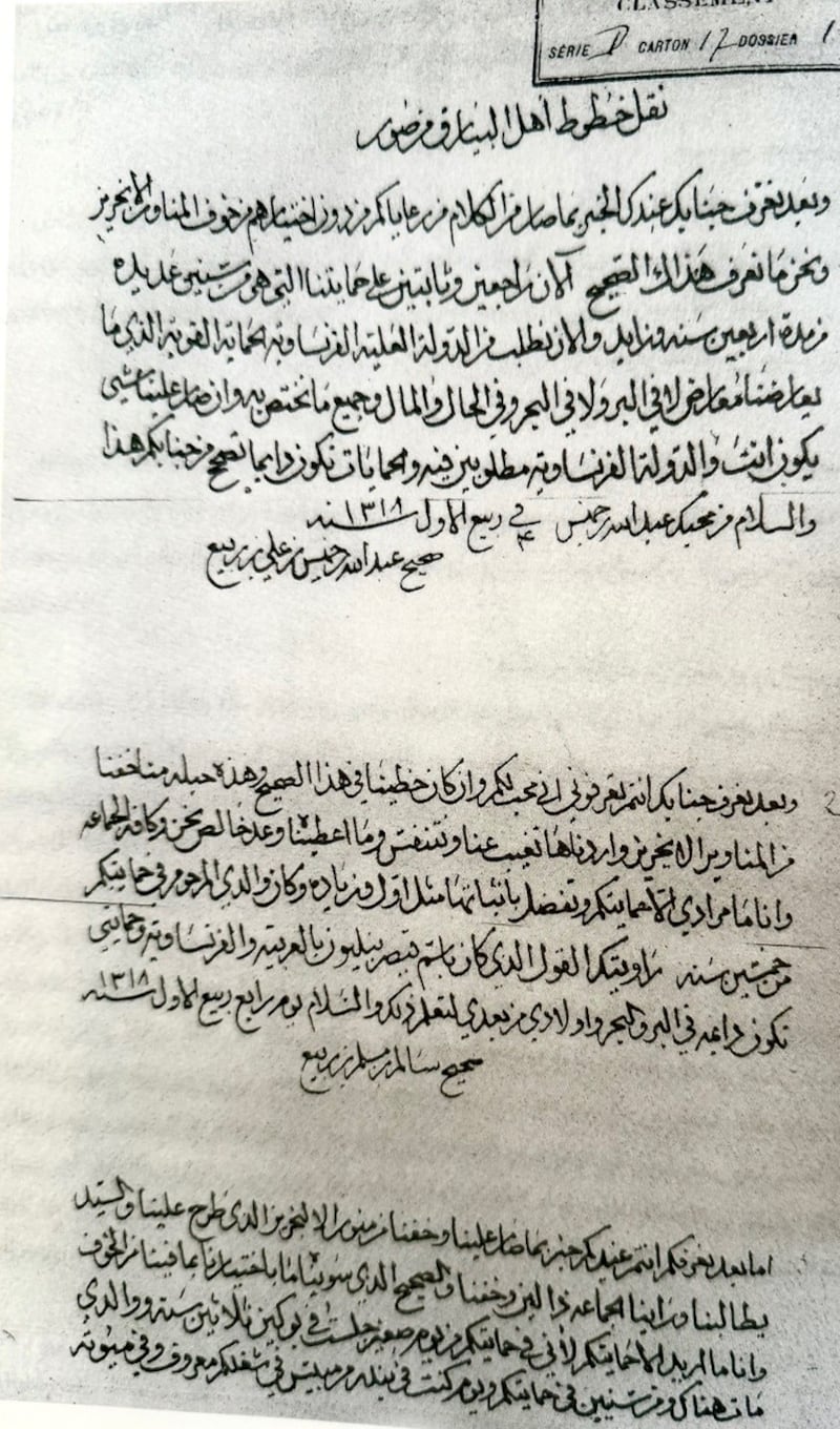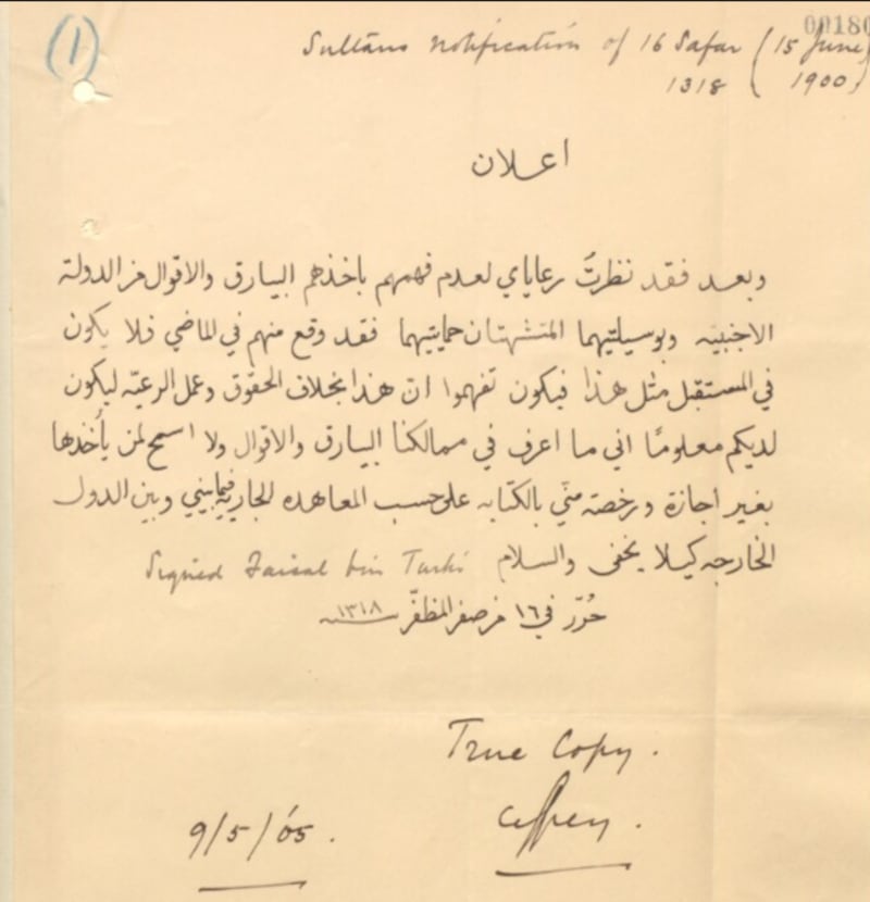 إعلان من السلطان بتاريخ 15 يونيو 1900م بخصوص رفع الأعلام الأجنبية على السفن