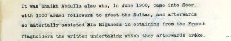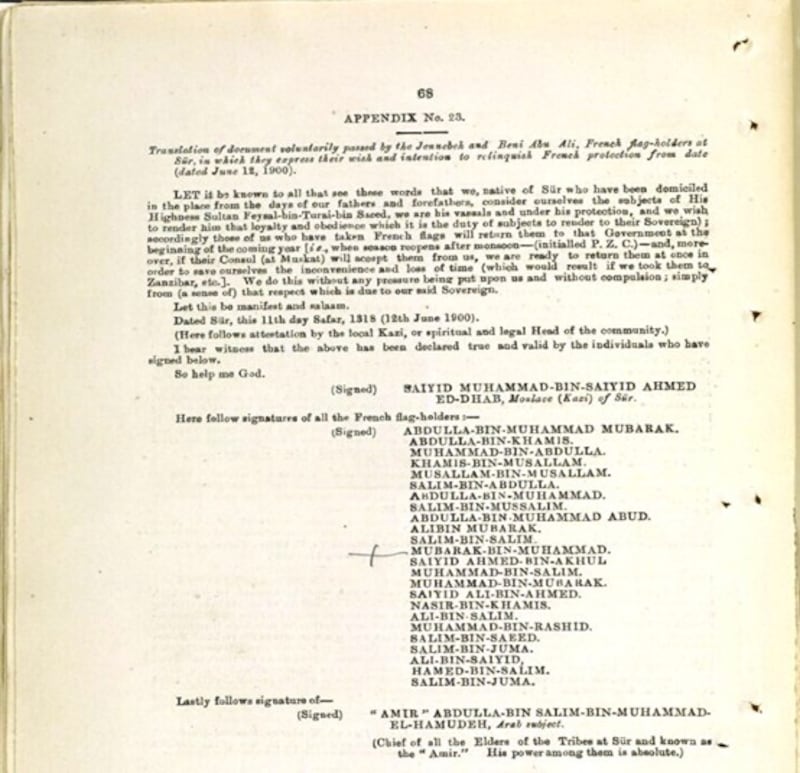 وقد شهدت الزيارة توقيع السلطان في 12 يونيو 1900م مع عدد من أصحاب السفن الصورية التي ترفع العلم الفرنسي على تعهد بإعادة تصاريح الملاحة الخاصة بهم إلى السلطات الفرنسية، وكان الشيخ عبد الله بن سالم آل حمودة أمير جعلان بني بو علي من ضمن الشهود الموقعين كونه أحد أكبر شيوخ المنطقة مكانةً ووجاهة.