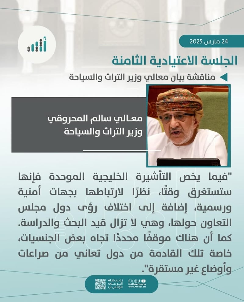 وكان معالي وزير التراث والسياحة قد صرح خلال استضافته في مجلس الشورى خلال شهر مارس الماضي في الجلسة التي حضرتها “أثير”، بأن التأشيرة السياحية الخليجية الموحدة ستستغرق وقتا، نظرا لارتباطها بجهات أمنية ورسمية، إضافة إلى اختلاف رؤى دول مجلس التعاون حولها، كما إن هناك موقفا محددا تجاه بعض الجنسيات خاصة القادمة من دول تعاني من صراعات وأوضاع غير مستقرة.