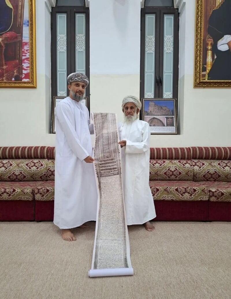 وأثناء زيارتي الأخيرة إلى ولاية إبراء واطّلاعي على جانب ممّا حوته خزانة الباحث الدكتور ناصر بن صالح الإسماعيلي المليئة بالعديد من المخطوطات والوثائق المهمة، شدّ انتباهي وثيقة يبلغ طولها حوالي ثلاثة أمتار تحوي خطبة عيد كتبها أحد أجداد الباحث صاحب الخزانة، ألا وهو الشيخ مانع بن علي بن عبدالله الإسماعيلي الذي يعد إحدى الشخصيات العديدة التي أنجبتهم هذه الأسرة العريقة في مختلف المجالات، والذين عرضنا لبعض أسمائهم ومنجزاتهم في تقارير سابقة.
