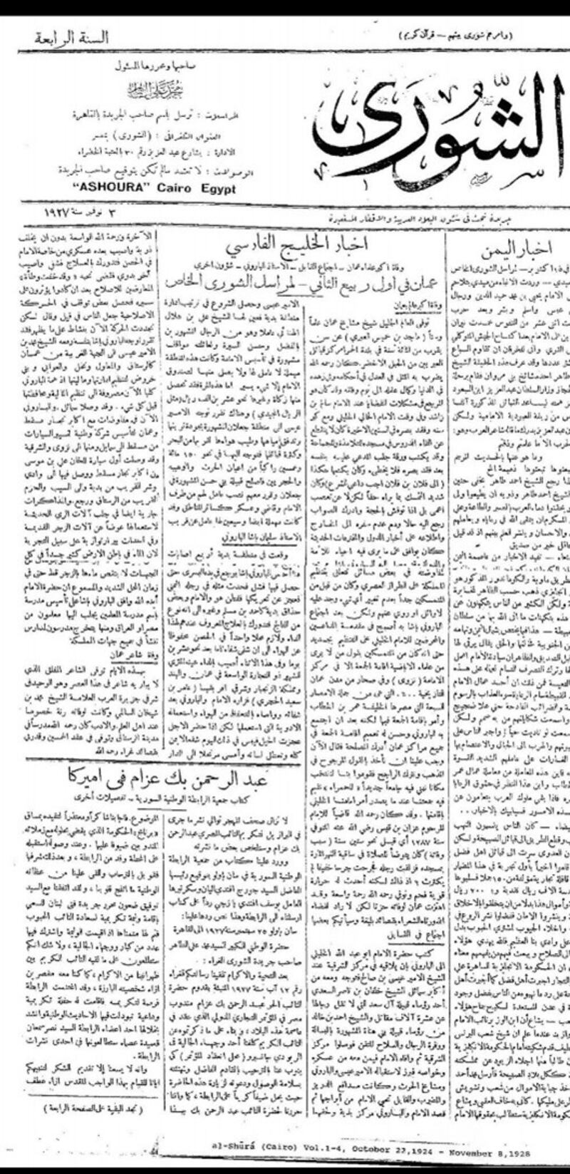خبر عن وفاة الشيخ ماجد بن خميس في جريدة الشورى عدد 3 نوفمبر 1927