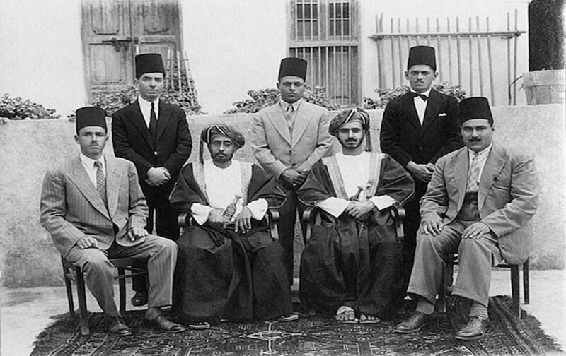 في المدرسة السلطانية جلوسًا من اليمين: إسكندر حنا، والسيد هلال بن بدر، والشيخ الزبير بن علي، وإسماعيل الرصاصى وخلفهم يقف عدد من مدرسي المدرسة. أرشيف صور إياد الرصاصي