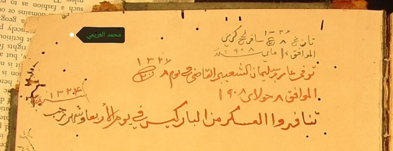 تقييد على إحدى المخطوطات يشير إلى وفاة الشاعر عامر بن سليمان الشعيبي