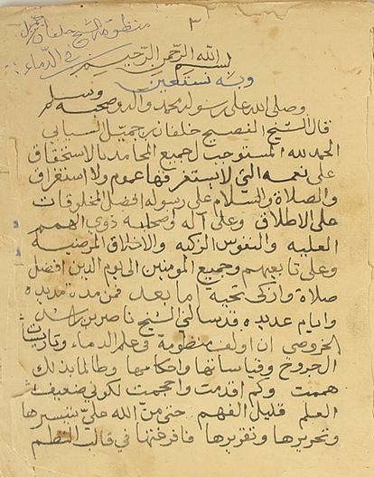 الصفحة الأولى من مخطوط منظومة الشيخ خلفان بن جميل في الدماء