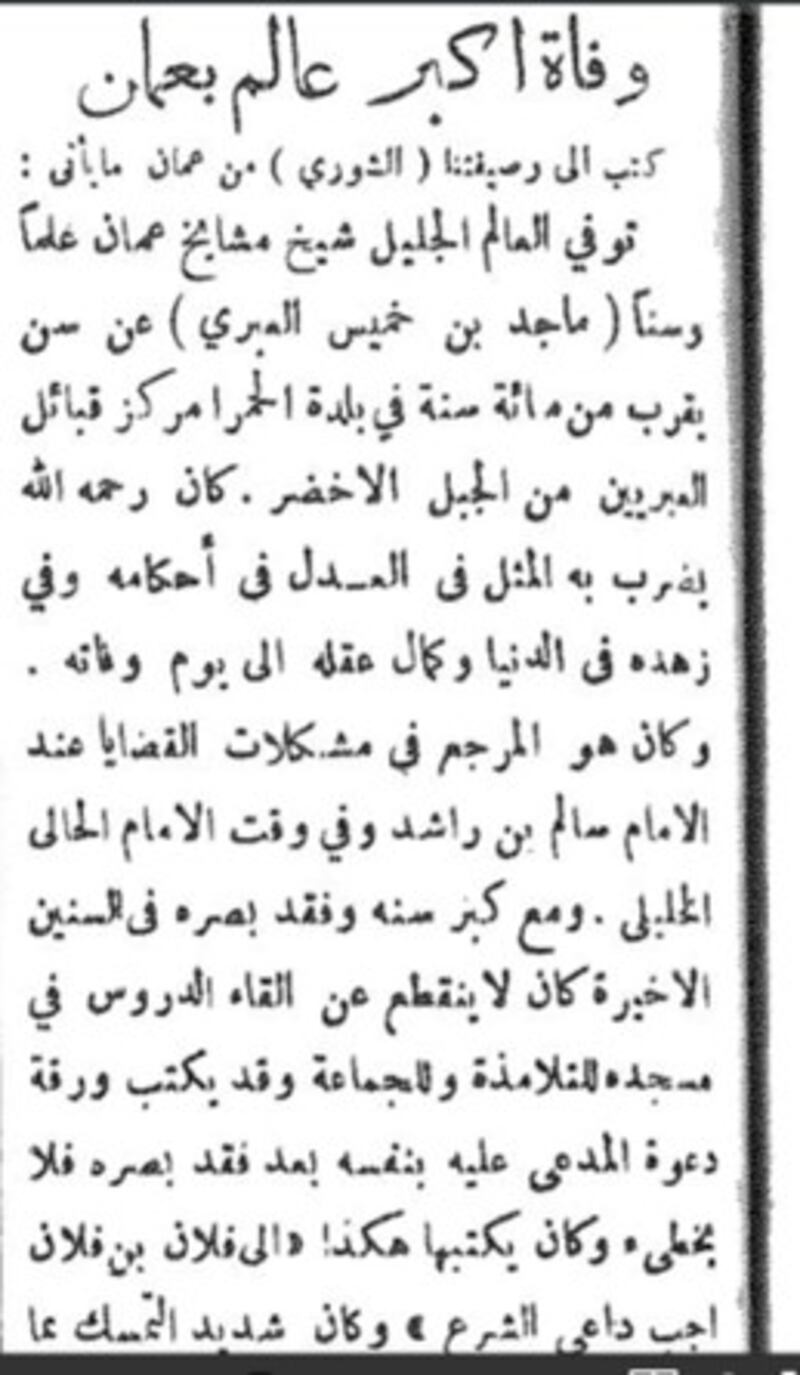 خبر في جريدة الفتح عام ١٩٢٧ حمل عنوان (وفاة أكبر عالم في عمان) نقلًا عن جريدة الشورى