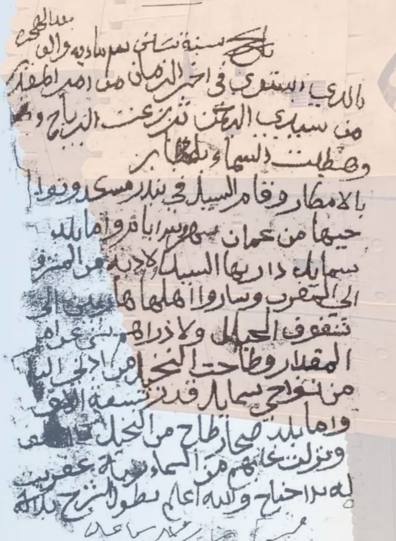 “تاريخ سنة ستين و٣ ماية وألف بعد الهجرة بالذي استوى في آخر الزمان من أمر المقدر من سيدي الرحمن تزعزعت الرياح وهطلت السماء بالأمطار وقام السيل في بندر مسكد ونواحيها من عمان شهر و٣ أيام، وأما بلد سمايل دار بها السيل والأودية من المشرق إلى المغرب وساروا أهلها هاربين إلى شغوف الجبال ولا ذراهم شيء عن أمر المقدر وطاحت النخيل من أدنى البلاد من نواحي سمايل قدر تسعة آلاف، وأما بلد صحار طاح من النخيل ١٧ ألف ونزلت عليهم من السماء ...عفريت له 12 جناح والله أعلم يطول الشرح بذلك"