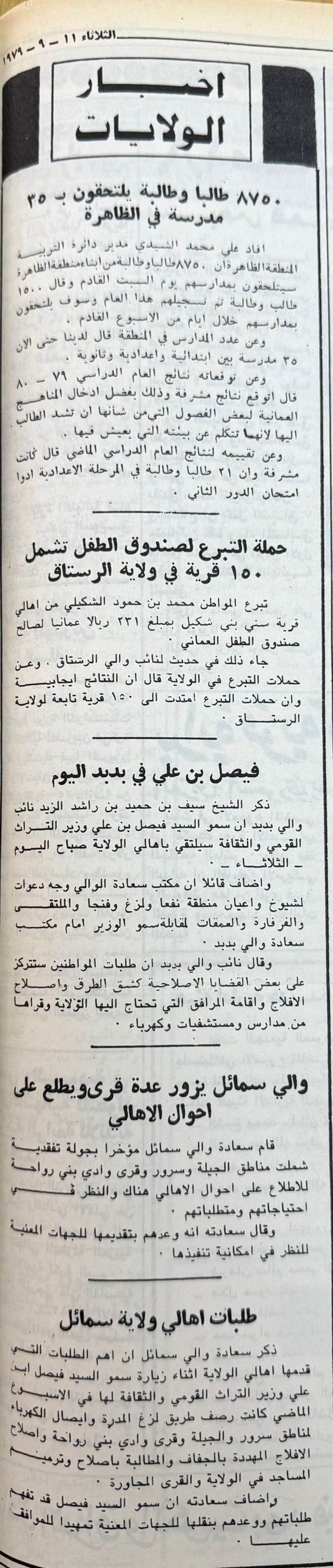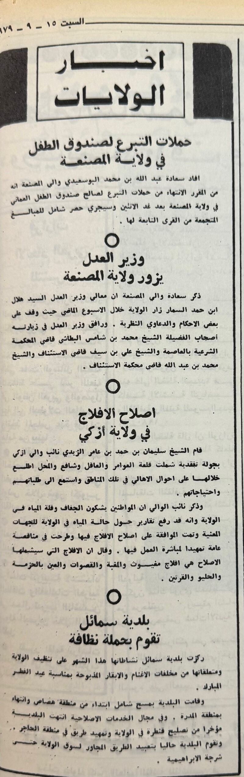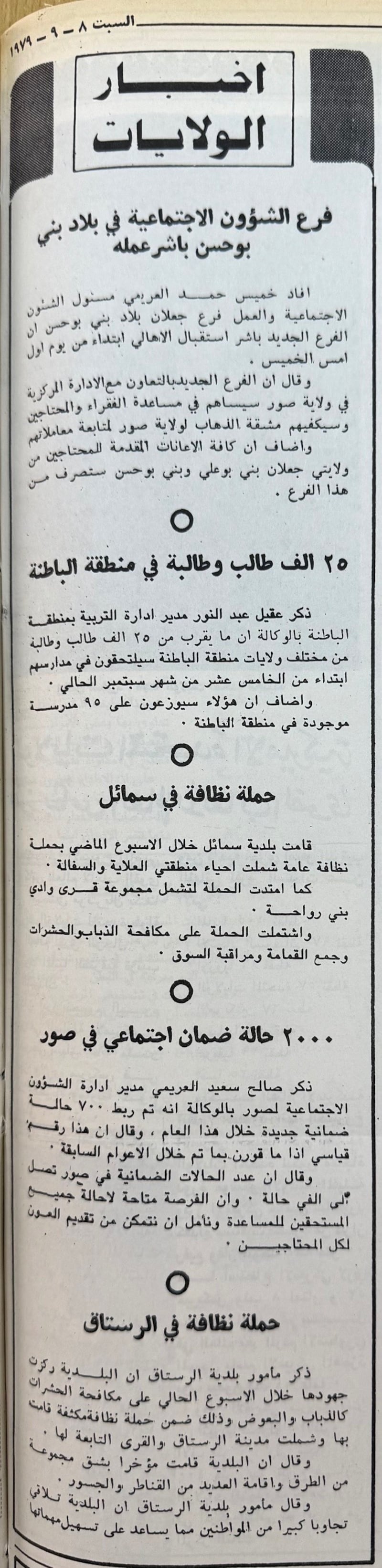 في عدد " عمان " الصادر يوم السبت 8 سبتمبر 1979م نقرأ الأخبار المحلية الآتية: افتتاح فرع للشؤون الاجتماعية بولاية جعلان بني بو حسن ومباشرة أعماله منذ يوم الخميس 6 سبتمبر وهو يخدم ولايتي جعلان بني بو حسن وجعلان بني بو علي، والتحاق ما يقرب من 25 ألف طالبًا وطالبة في منطقة الباطنة موزعين على (95) مدرسة بمدارسهم ابتداءً من يوم 15 سبتمبر، وتنفيذ حملة نظافة عامة قامت بها ولاية سمائل غطّت عددًا من أحياء العلاية والسفالة وقرى وادي بني رواحة.