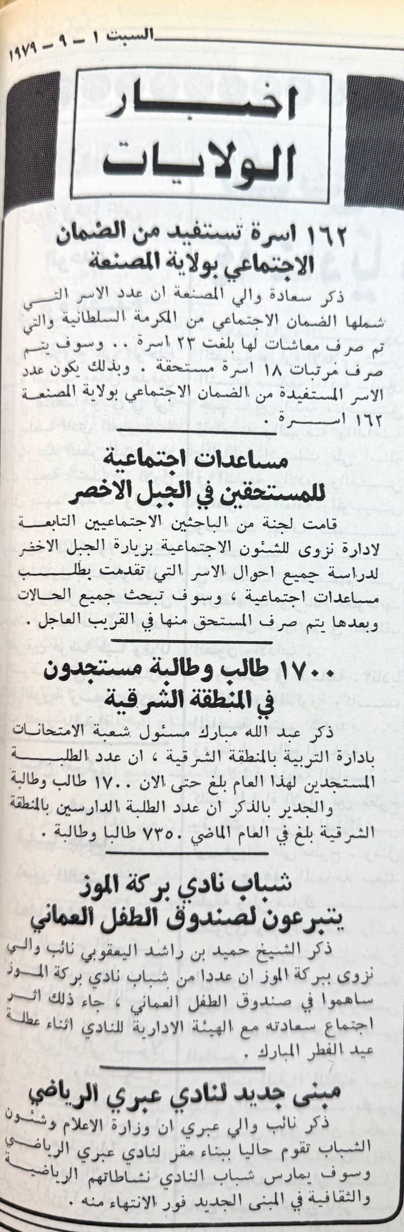 طالعتنا جريدة “عمان” في عددها الصادر يوم السبت الأول من سبتمبر 1979م بعدّة أخبار محلية من بينها: استفادة (162) أسرة من الضمان الاجتماعي بولاية المصنعة، وقيام لجنة من الباحثين الاجتماعيين التابعة لإدارة نزوى للشؤون الاجتماعية بزيارة الجبل الأخضر لدراسة جميع أحوال الأسر التي تقدمت بطلب مساعدات اجتماعية، و (1700) طالب وطالبة مستجدون للعام الدراسي 79/1980 في مدارس المنطقة الشرقية.