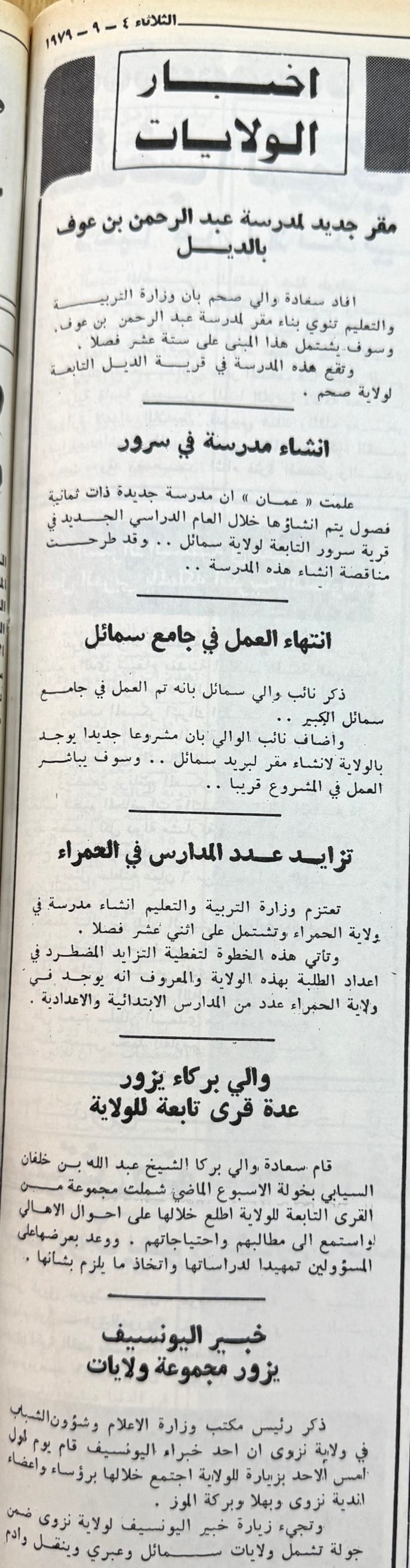 في عددها الصادر يوم الثلاثاء الرابع من سبتمبر 1979م طالعتنا جريدة “عمان” بعدد من الأخبار المحلية من ضمنها: مقر جديد لمدرسة عبد الرحمن بن عوف بالديل التابعة لولاية صحم يشتمل على ستة عشر فصلًا، وإنشاء مدرسة في قرية سرور التابعة لولاية سمائل، وانتهاء العمل في جامع سمائل بالإضافة إلى بدء العمل في إنشاء مقر لبريد سمائل.