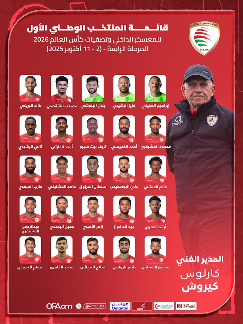 اختار المدرب البرتغالي كارلوس كيروش المدير الفني لمنتخبنا الوطني قائمة اللاعبين للمشاركة في المعسكر التدريبي الداخلي قبل أيام على انطلاق المشاركة في المرحلة الرابعة من التصفيات المؤهلة لكأس العالم 2026.
