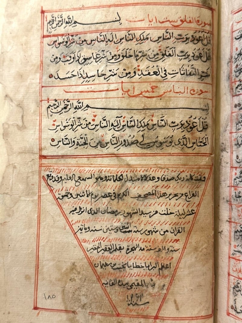 ويبرز في عمل الناسخ حرصه على التمييز البصري بين أسماء السور ونصوص الآيات، ما يسهل القراءة والتلاوة، كما يُظهر المخطوط الطابع العملي الوظيفي أكثر من الطابع الجمالي، حيث تجنّب الناسخ الزخارف المزخرفة وركّز على وضوح النص وتوثيقه، وفي الصفحات الأخيرة أُدرجت تقييدات تاريخية واجتماعية، ما يضفي على المخطوط قيمة مضاعفة: دينية وتوثيقية في آنٍ واحد.