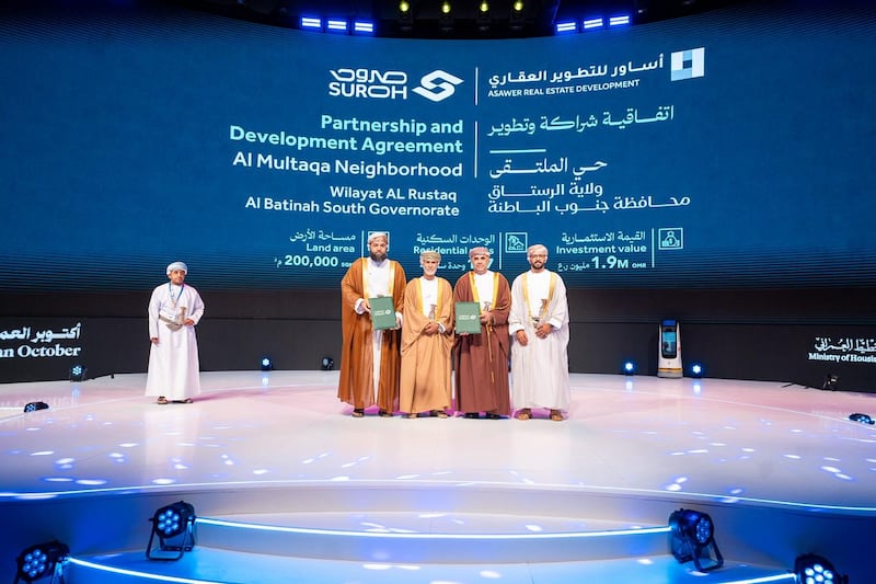 شهد المعرض توقيع اتفاقيتين جديدتين ضمن مبادرة «صروح» لتطوير أحياء سكنية متكاملة في محافظتي جنوب الباطنة وجنوب الشرقية، بإجمالي استثمارات تفوق 11 مليون ريال عُماني. فقد تمثلت الاتفاقية الأولى في تطوير حي الملتقى بولاية الرستاق على مساحة تتجاوز 766 ألف متر مربع، ويضم المشروع 715 وحدة سكنية، بإجمالي قيمة استثمارية تُقدّر بنحو 7 ملايين ريال عُماني، وذلك من تطوير شركة أساور للتطوير العقاري.