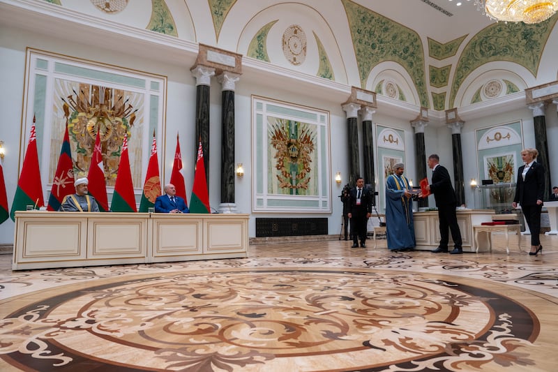 شهد جلالة السلطان حفظهُ اللهُ ورعاهُ ورئيس جمهورية بيلاروس التّوقيع على اتفاقيتين و 4 مذكرات تفاهم بقصر الاستقلال في العاصمة البيلاروسية: