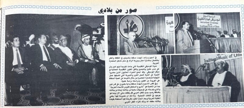 نظّمت سلطنة عمان ممثّلةً بمركز عُمان للموسيقى التقليدية خلال الفترة من السادس إلى السادس عشر من أكتوبر عام 1985م فعاليات الندوة الدولية للموسيقى العمانية التقليدية بمشاركة حوالي 40 من الباحثين والإعلاميين المعنيّّين بالفنون التقليدية في أول ملتقى من نوعه في منطقة الخليج العربي، بهدف جمع وتوثيق الموسيقى التقليدية العُمانية.