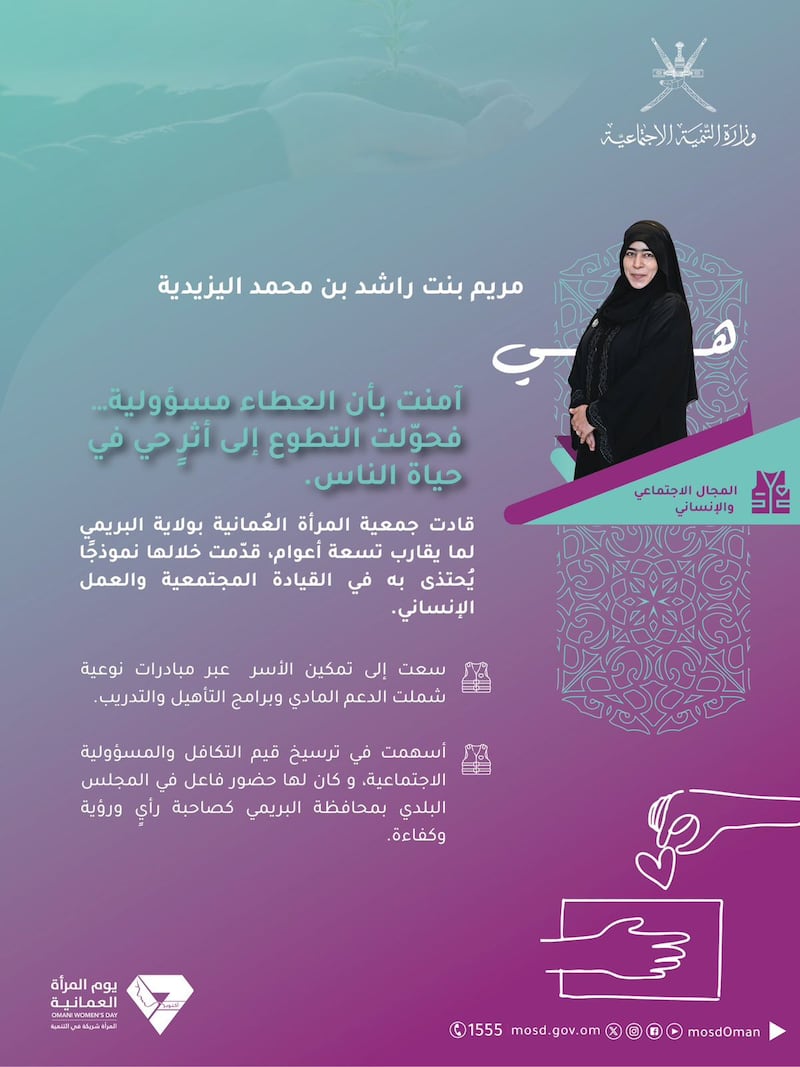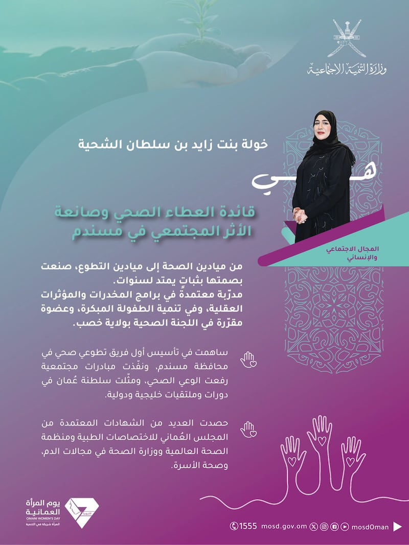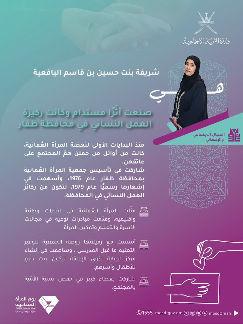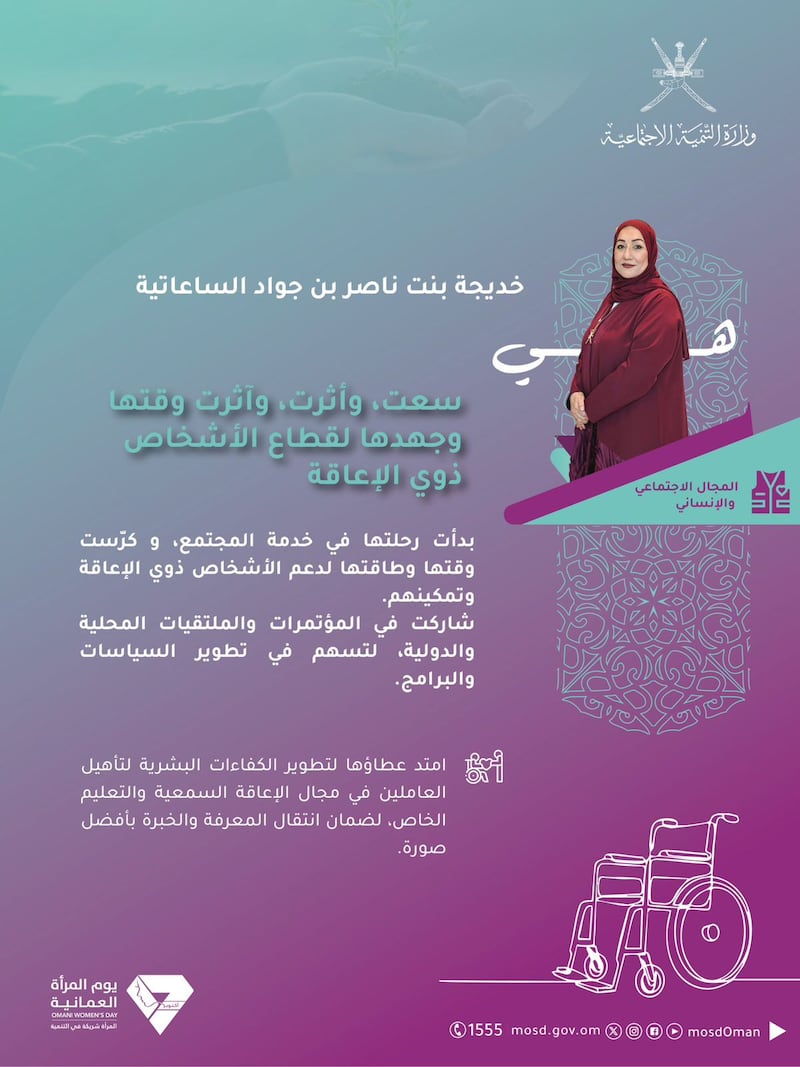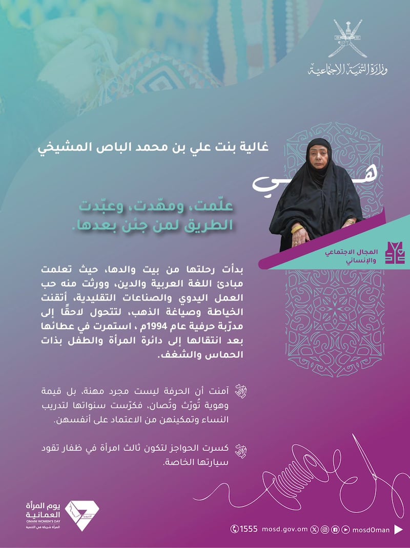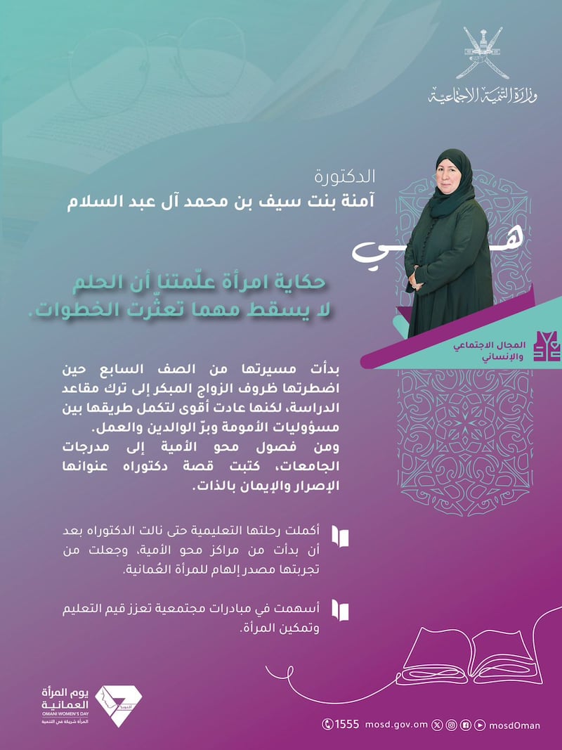 ويأتي التكريم تأكيدًا على المكانة الرفيعة التي تحظى بها المرأة العُمانية، والدّعم المتواصل الذي تناله كشريكٍ رئيسٍ في بناء الوطن وصناعة مستقبله، بقيادة حضرةِ صاحبِ الجلالةِ السُّلطان المعظم -حفظهُ اللهُ ورعاهُ-.