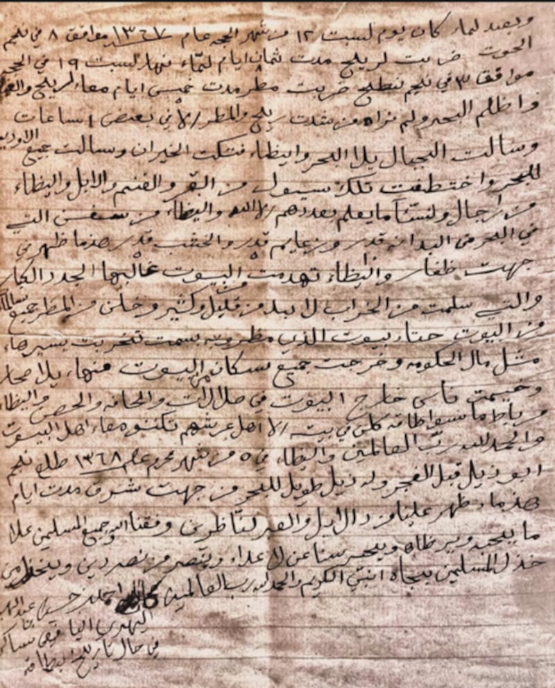 كما ورد في هامش إحدى مراسلات السلطان سعيد بن تيمور إلى إحدى الشخصيات السياسية والاجتماعية القريبة منه في تلك الفترة وهو الشيخ الزبير بن علي بن جمعة في ذي الحجة من عام 1367هـ، إشارة إلى تلك الضربة، حيث كتب السلطان: " لقد وصلتنا البرقيات من الوالي حمود عن الأمطار والبحر ونسأل الله أن يلطف بعباده. نرجو أن تحرر إلينا عن ذلك بالتفصيل...“.