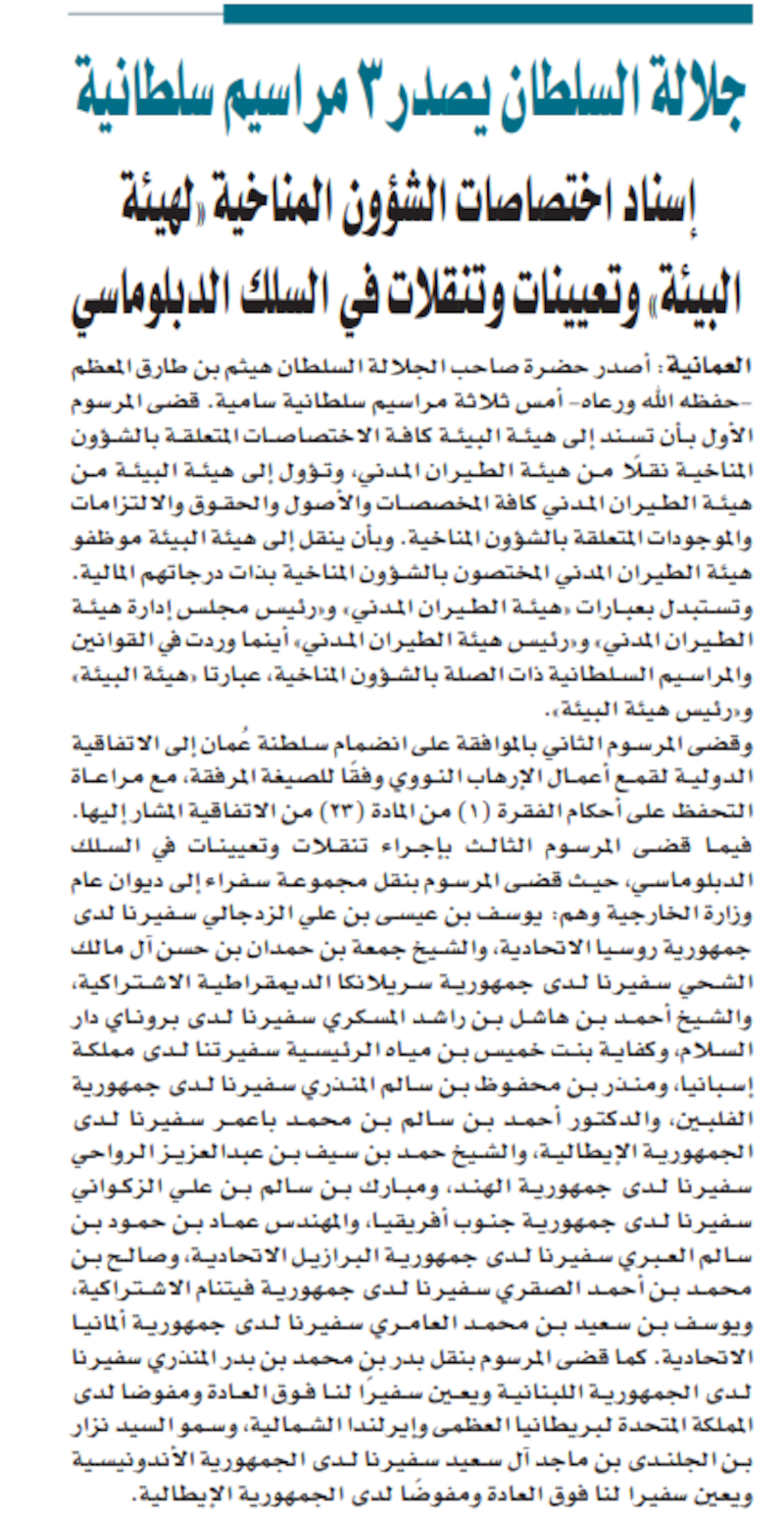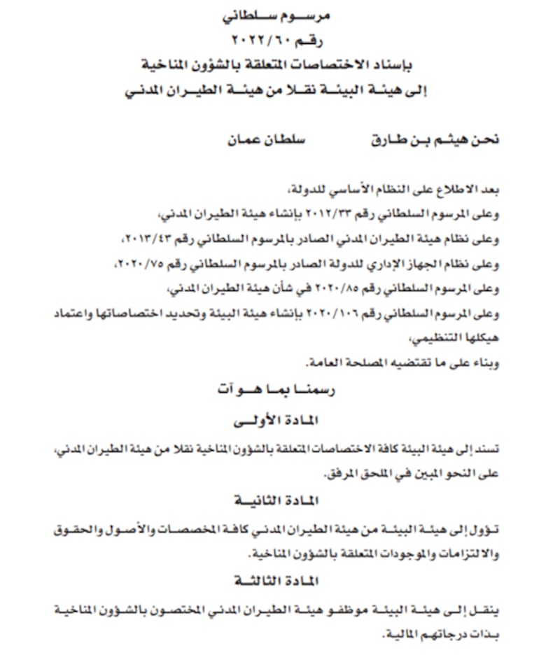 صدر في الثاني من أكتوبر عام 2022 المرسوم السلطاني رقم ٦٠ / ٢٠٢٢ الخاص بإسناد الاختصاصات المتعلقة بالشؤون المناخية إلى هيئة البيئة نقلا من هيئة الطيران المدني، والذي نصّ في بعض بنوده على أن تسند إلى هيئة البيئة كافة الاختصاصات المتعلقة بالشؤون المناخية نقلا من هيئة الطيران المدني، على النحو المبين في الملحق المرفق، وأن تؤول إلى هيئة البيئة من هيئة الطيران المدني كافة المخصصات والأصول والحقوق والالتزامات والموجودات المتعلقة بالشؤون المناخية، وأن ينقل إلى هيئة البيئة موظفو هيئة الطيران المدني المختصون بالشؤون المناخية بذات درجاتهم المالية.