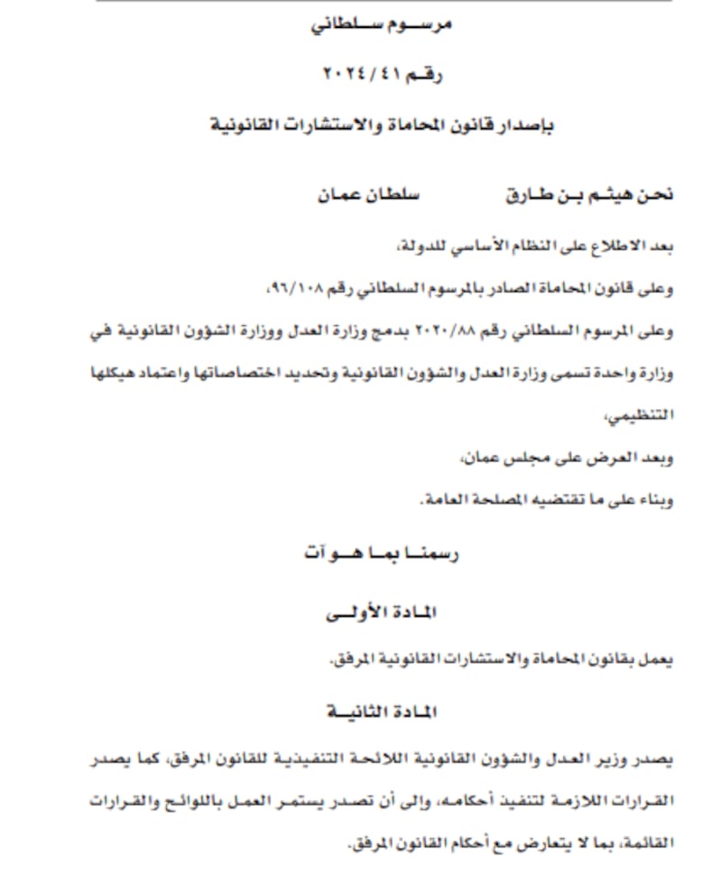 صدر في الثالث من أكتوبر عام 2024 المرسوم السلطاني رقم ٤١ / ٢٠٢٤ الخاص بإصدار قانون المحاماة والاستشارات القانونية، والذي نصّ على أن يعمل بقانون المحاماة والاستشارات القانونية المرفق، وأن يصدر وزير العدل والشؤون القانونية اللائحة التنفيذية للقانون المرفق، كما يصدر القرارات اللازمة لتنفيذ أحكامه، وإلى أن تصدر يستمر العمل باللوائح والقرارات القائمة، بما لا يتعارض مع أحكام القانون المرفق.