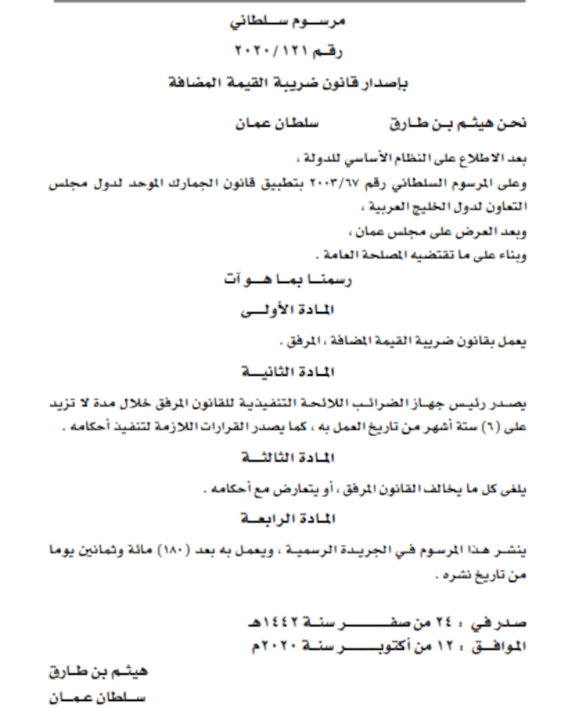 في الثاني عشر من أكتوبر 2020 صدر المرسوم السلطاني رقم ١٢١ / ٢٠٢٠ الخاص بإصدار قانون ضريبة القيمة المضافة، والذي نصّ على أنه يعمل بقانون ضريبة القيمة المضافة، المرفق، وأن يصدر رئيس جهاز الضرائب اللائحة التنفيذية للقانون المرفق خلال مدة لا تزيد على (٦) ستة أشهر من تاريخ العمل به، كما يصدر القرارات اللازمة لتنفيذ أحكامه.