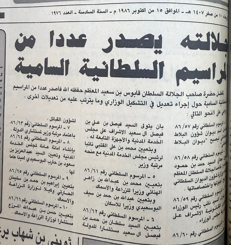 والمرسوم السلطاني رقم 62/86 بتعيين السيد سلطان بن حمد بن فيصل آل سعيد مستشارًا للدولة لشؤون القبائل، ومراسيم أخرى بتعين عدد من الوكلاء والمستشارين.